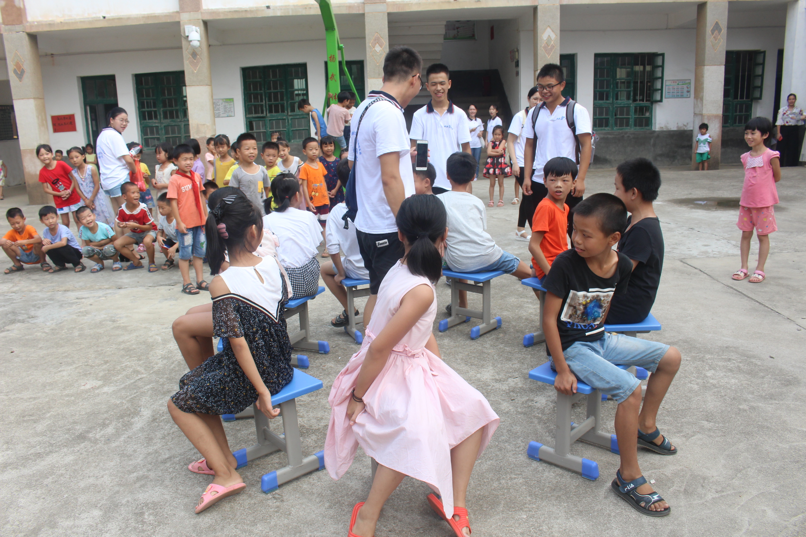 9月4日,“红征筑梦队”第一次来到贺家桥小学。第一天的活动是教孩子们环保知识,带他们做游戏,表演节目。学校老师介绍到,该校大部分员工为留守儿童,家境多贫困。面对初始有些害羞的员工们,志愿者充满耐心、爱心,在操场上做游戏互动时,送上一份份小礼品,气氛便才逐渐变得活跃起来。一天下来,志愿者与员工共同玩耍,相处融洽。