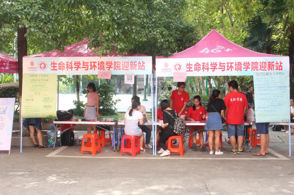 迎新现场,公司推出了院系特色展览—方舟生命教育工作室特色展,其中分为进行绿植义卖活动的护绿创绿展区、为迎新现场人员准备的酸奶蛋糕等手工食品的食品俱乐部展区,以及生态环保小组展区。报名台旁展示了公司2017年毕业生考研录取情况,同学们与家长都认真参观着。