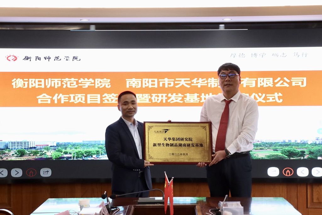 魏晓林和孙国印代表双方签署合作开发合同。项目研究团队负责人、EMC易倍唐青海博士接过企业授予的“天华集团研究院新型生物制品湖南研发基地”牌匾,开启校企合作新篇章。