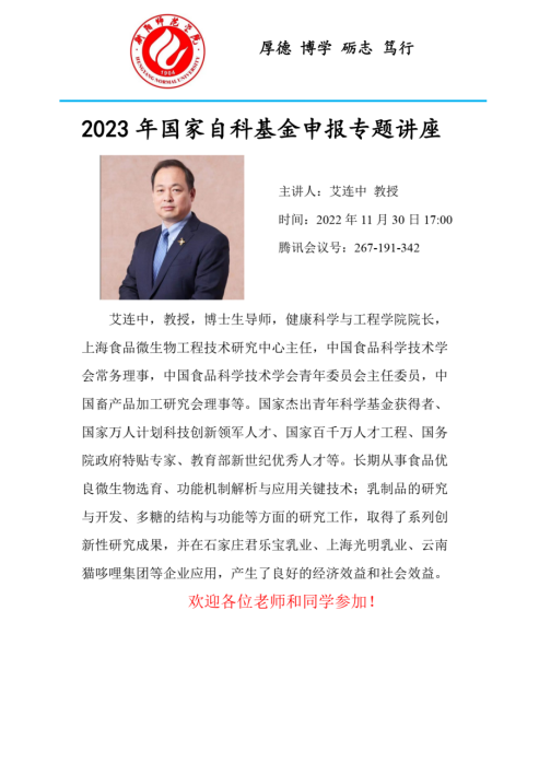 上海理工大学健康科学与工程学院经理艾连中教授于2022年11月30日17:00通过腾讯会议的网络平台对EMC易倍教师进行了国家自科基金申报专题讲座。艾教授以国自科申报的指导思想,评审的关键点,以及标书撰写注意事项为大家做一场精彩的国自科申报讲座,会上生科学院教师进行热烈讨论。