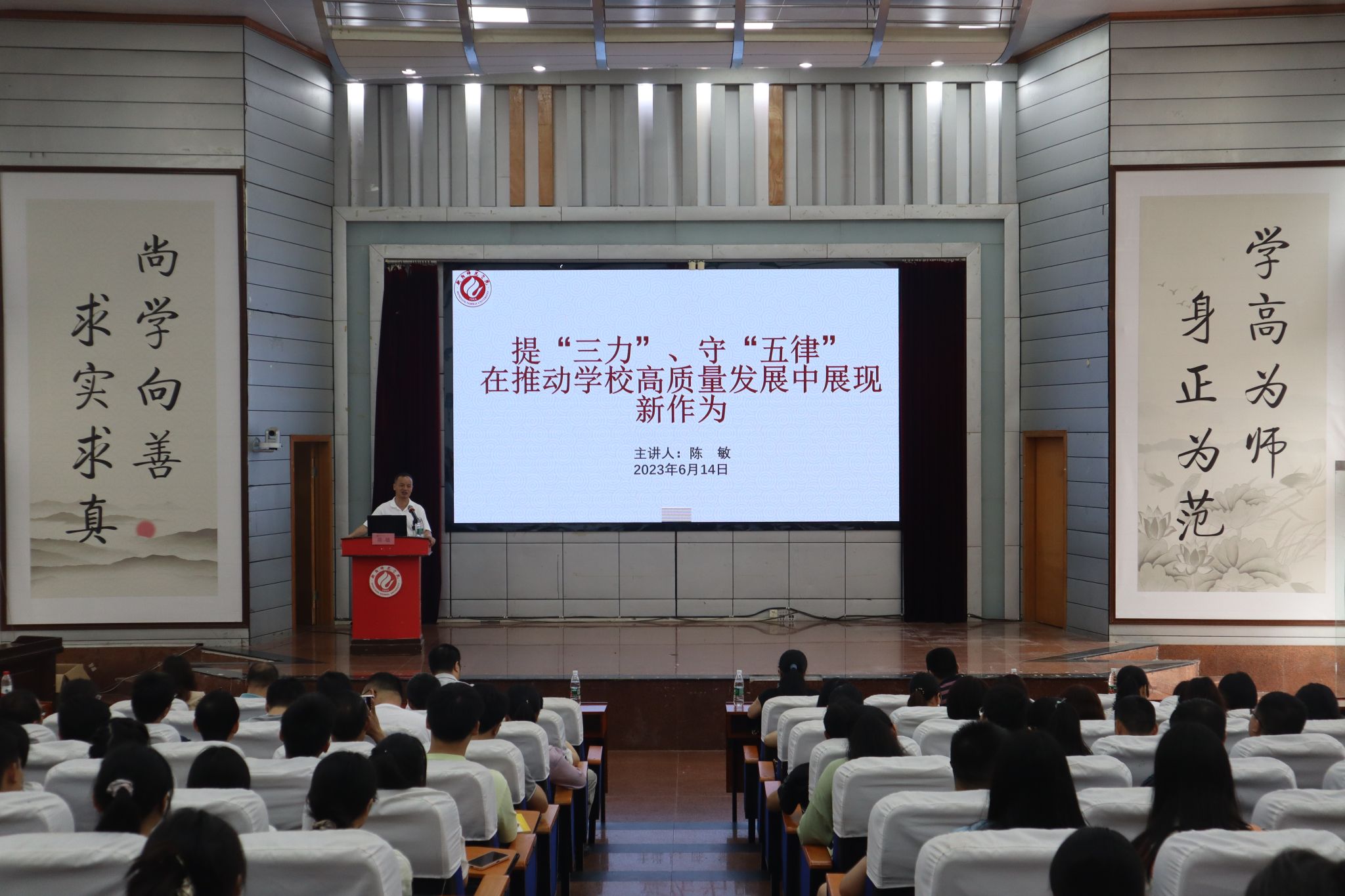 陈敏以《提“三力”、守“五律”, 在推动学校高质量发展中展现新作为》为题,介绍了当前国内外面临的风险与挑战,科学阐述了教育的本质与首要问题,提出了学校的根本任务和教师的首要任务,指出全体党员要自觉增强看家本领,提升“政治能力、思维能力、实践能力”,做政治上的明白人、思维上的智慧人、实践上的能干人。要求党员们要把握规律、遵守法律、服从纪律、接受他律、强化自律,模范遵守“五律”,自信自强,守正创新,勇于担当,在实践中展现新作为。