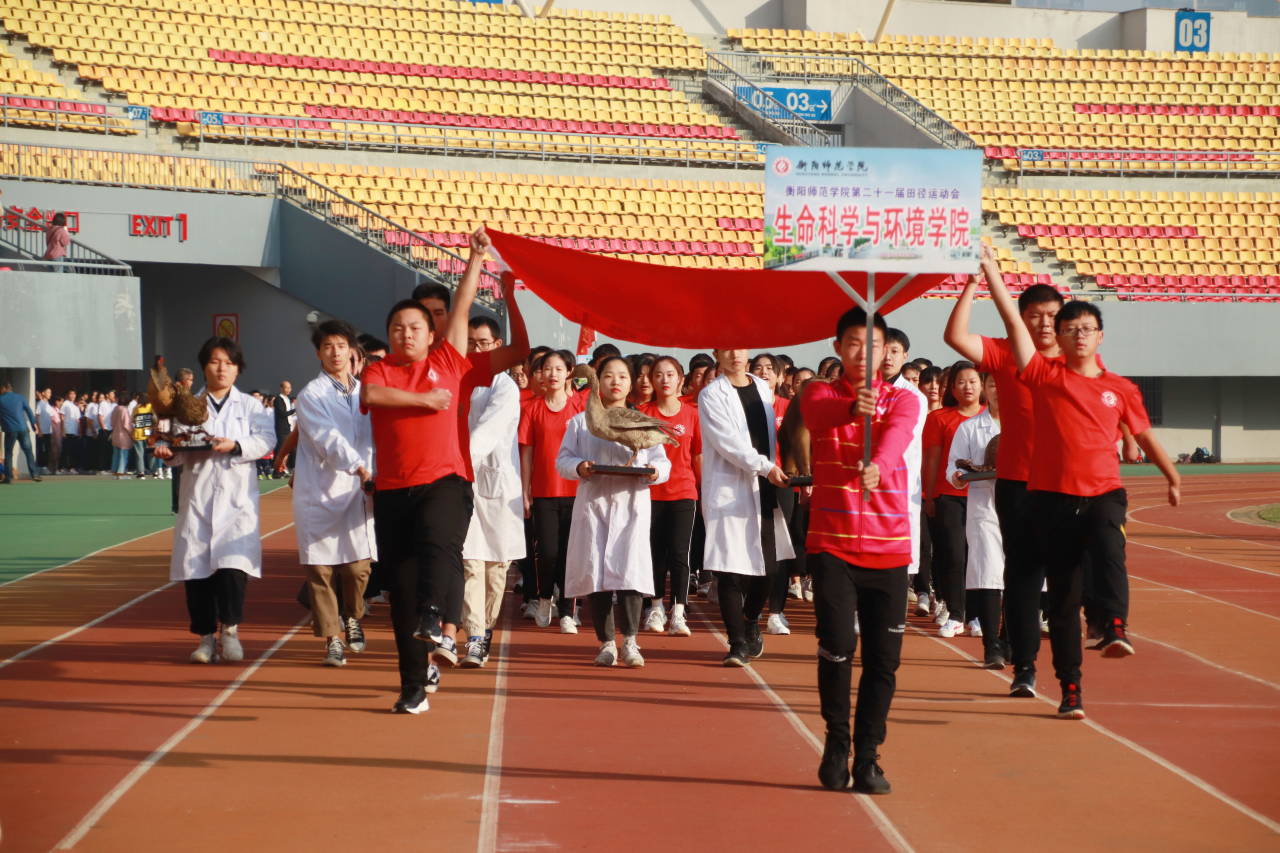 上午八时三十分,伴着激昂的进行曲,国旗方队、校旗方队、裁判员方队、学校23个分工会方阵队等依次出场。观众席上不时响起为各个方阵鼓掌加油的声音。朝气蓬勃的队员们在运动场上踏着整齐的步伐迈入操场。公司方阵队身着红黑二色服装迈着整齐划一的步伐,在运动场上激扬喊出“攻无不克,战无不胜,生环学子,更上层楼”的口号,用青春点燃生命之火,用热血绽放环境之光。在院旗队伍后面,几名员工身着白色实验服托举着棕熊、狼、穿山甲等珍贵动物标本从主席台前走过,一个个标本展示着生环学院探索生物奥秘的神奇力量。