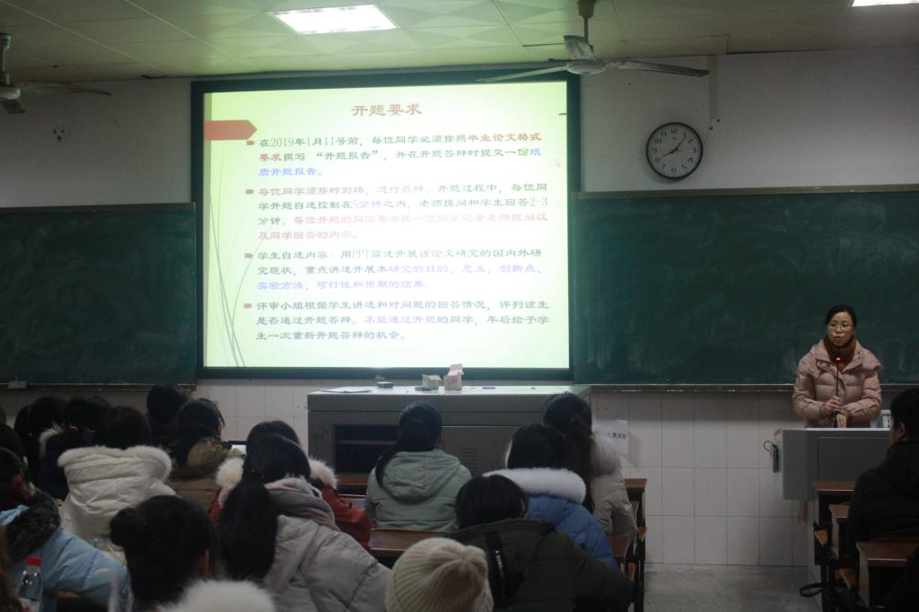 本次开题报告会由陈晓华老师主持。首先,她分别从开题内容、形式种类、撰写方法以及答辩时需要注意的问题等作了详细讲解,而后,她就使用实验室的要求及注意事项、实验用品的准备等方面向大家进行了详细地说明。