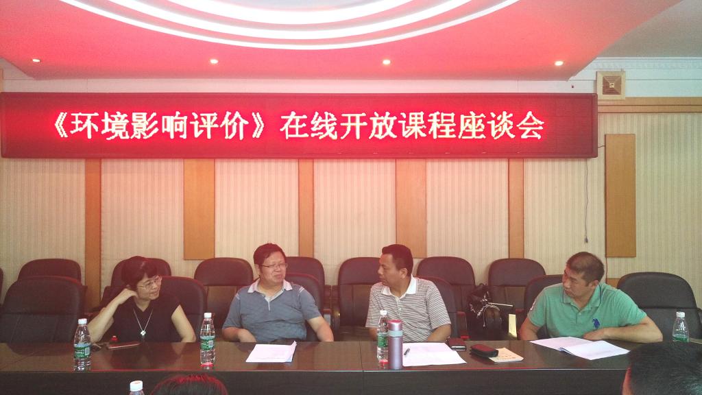报告会前,曹丽敏经理、易诚副经理、杨海副经理与程教授在办公楼三楼会议室召开了《环境影响评价》在线开放课程座谈会,王晶、邓景衡、罗远来等专业老师一同参会,交流学习。易诚副经理就申报湖南省精品在线开放课程—《环境影响评价》,与程教授开展深入交流。