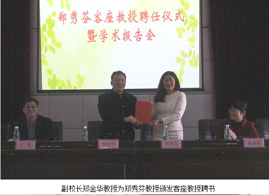 聘任仪式上,曹经理对郑秀芬教授的基本情况及其学术业绩进行了介绍,郑金华副董事长代表学校对郑秀芬教授的来访表示了诚挚的欢迎,并为其颁发了EMC易倍官网客座教授聘书。