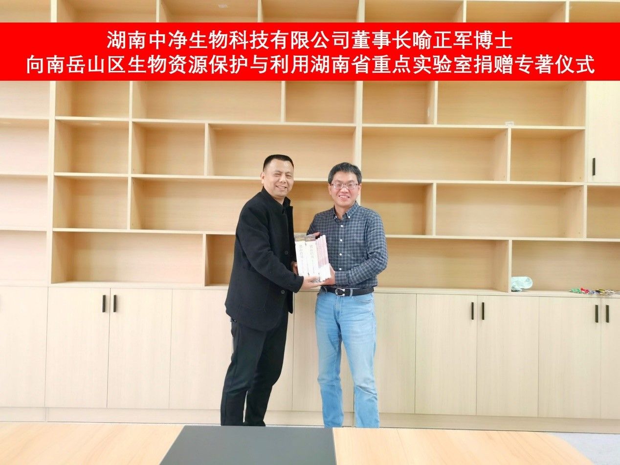 洽谈会后,喻正军博士为公司“南岳山区生物资源保护与利用湖南省重点实验室”和“现代农牧产业学院”捐赠了《猪海拾贝》等多套专著,易诚经理代表学院接受了捐赠。
