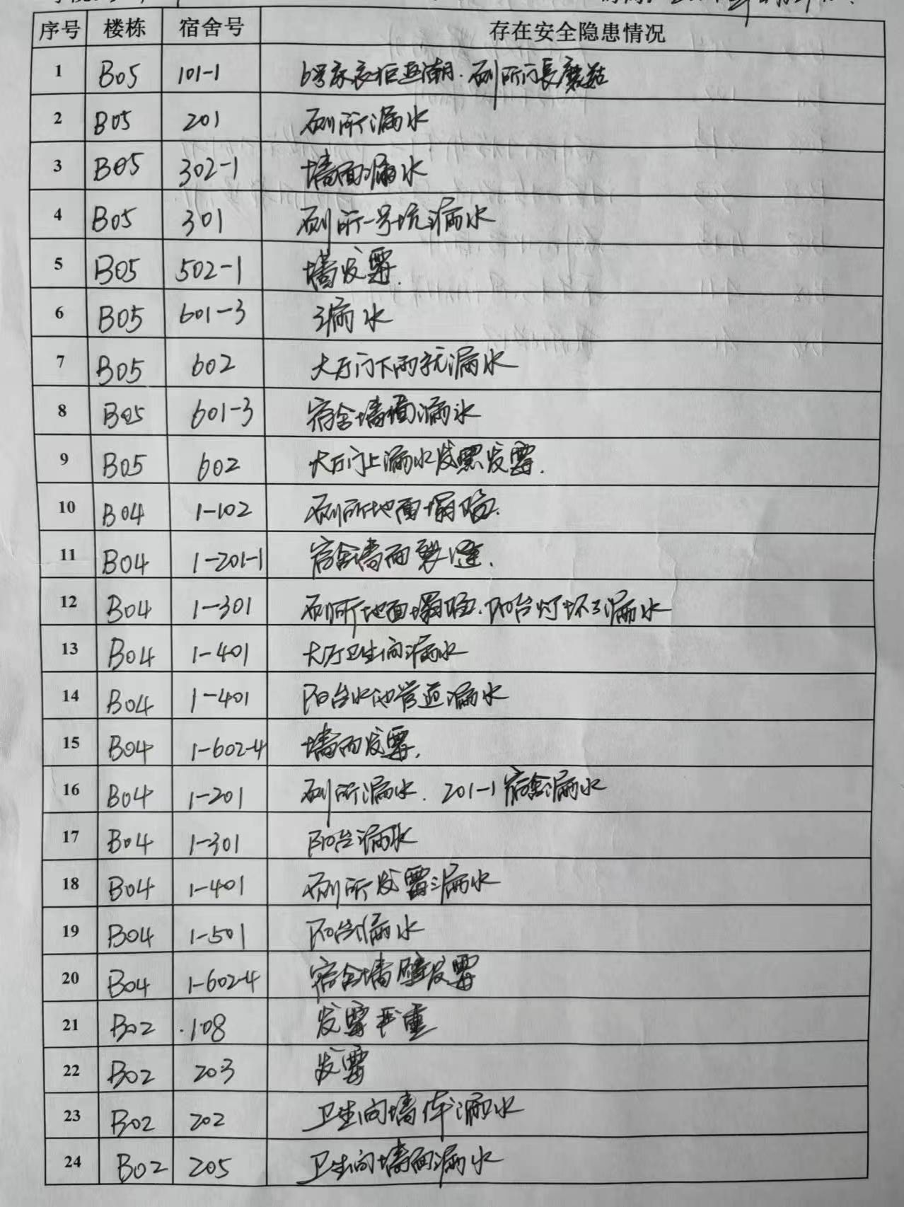 为确保排查工作深入细致,学院采取每个宿舍过一遍,每个房间查一遍的形式,拉网式排查。每到一个宿舍,深入每个房间,查看每个角落,询问每名员工,看是否存在安全隐患,是否有不安全的苗头,是否存在困难问题,并结合当前发生的安全事故,对员工进行随机安全教育,普及安全常识。特别是对用电安全、消防安全等做出强调。同时,对排查过程中存在安全问题详细记录,并明确整改时限。对排查中发现的私自移动书桌衣柜限本周内回归到位,对存在卫生间阳台管道漏雨、厕所门栓不稳固、风扇损坏、灯管不亮等问题及时报修,对墙体发霉、地面返潮、衣柜床板潮湿等问题提醒同学们及时晾晒衣被,宿舍保持通风透气,保持宿舍卫生。