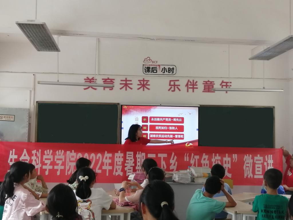 员工是祖国的未来和希望,对他们开展党史、国史教育,用中国共产党和中华人民共和国的光辉历史去教育、培养青少年一代,使他们能够继承革命传统,发扬优良作风。因此,生科学院实践团的志愿者们有针对性地开展了微党课宣讲,带领同学们了解红色革命人物的故事,其中有“永远做共产党人”的蒋先云、“视死如归”的张秋人和“湖南农民运动先驱”雷晋乾。通过带领同学们了解三位红色人物,带领大家了解先烈们身上的故事,让同学们能够从中获得触动,有感而发,努力学习,报效祖国,在同学们的心里种下爱国爱党的种子。