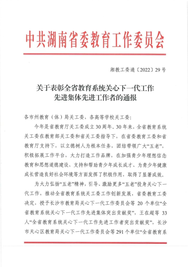近日,省委教育工委印发了《关于表彰全省教育系统关心下一代工作先进集体先进工作者的通报》,公司荣获“全省教育系统关心下一代工作先进集体”荣誉称号。